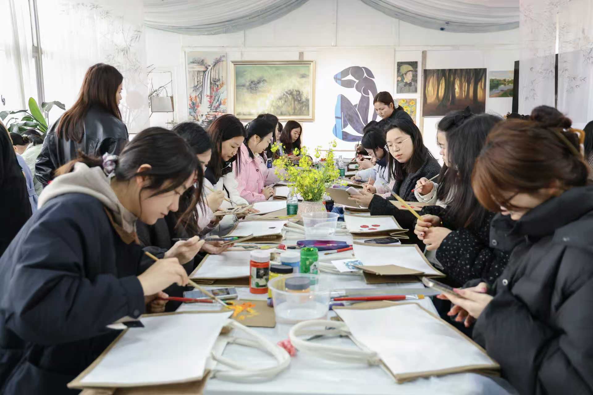 活动伊始,专业绘画老师为大家详细讲解了在帆布包上绘画的基本技巧,包括构图要领、色彩搭配原理以及颜料使用方法。从勾勒线条到调色晕染,每一个步骤都蕴含着艺术创作的乐趣。大家听得聚精会神,不时提问互动,在老师的耐心指导下,纷纷执笔创作。一笔一画间,原本素净的帆布包,在女职工们的巧思与巧手下,渐渐被赋予鲜活的生命力,普通的帆布包变成了独一无二的艺术单品。现场欢声笑语不断,大家互相欣赏作品,交流绘画心得,分享创作的喜悦。